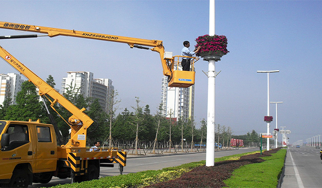 輕型伸縮臂高空車更換照明路燈施工現場… -